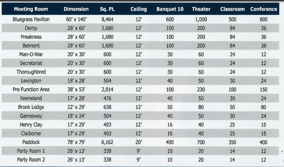 We have Lexington KY event venues for under 80 or over 800. Our conference center can be used for large luncheons, or broken up into smaller break-out rooms. We have 13 conference rooms and 2 smaller party rooms. Ranging from the Bluegrass Pavilion, at 8, 400 square feet, to our brand-new party rooms which have 500 square feet.